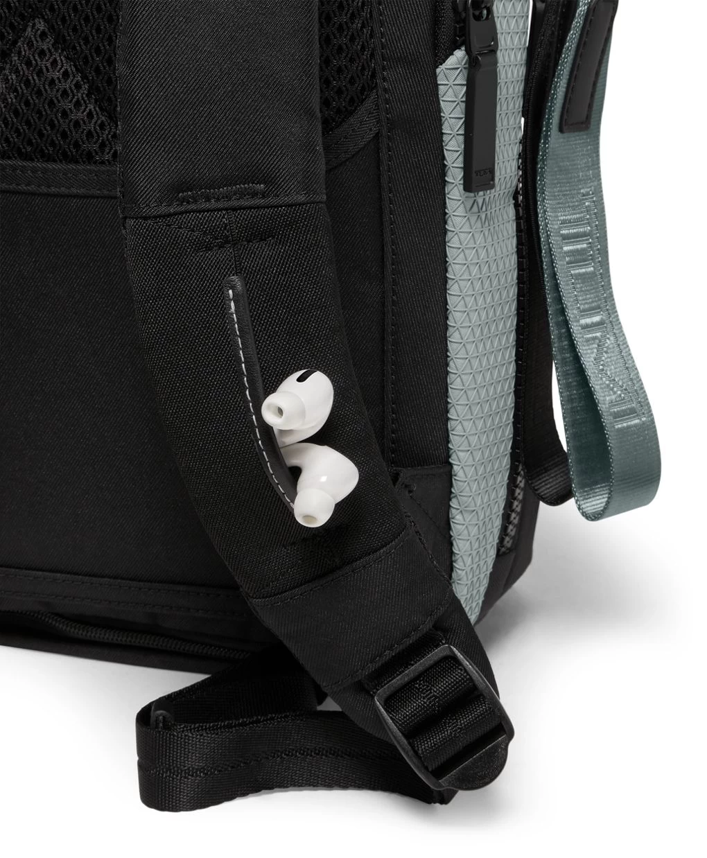- Elastic earbud pocket on backpack strap